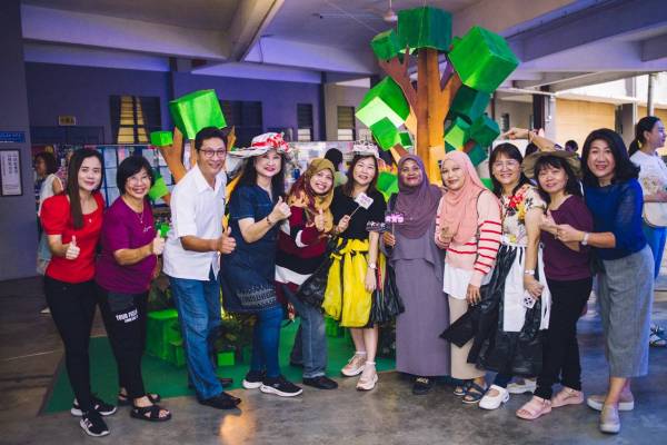 由董家协及爱心家长们以回收物品亲手制作的许愿树、地球盖章手印、纸皮树、长颈鹿装置艺术,以及宝特瓶制作的水立方与报纸手工衣服,成为全场焦点,生动传递环保理念。